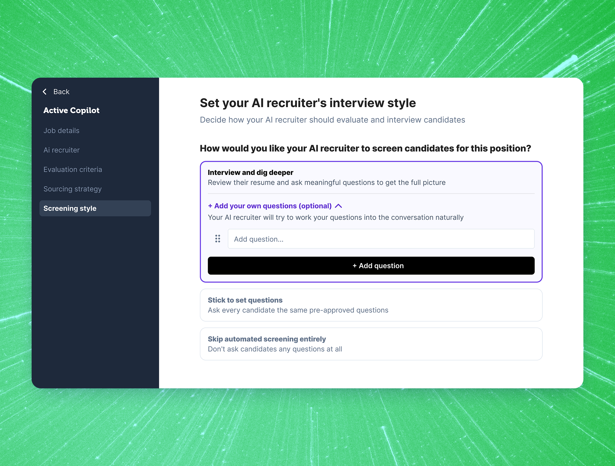 Guided Screening Conversations - You can now provide your AI recruiters with specific topics or questions to cover during dynamic screening, ensuring critical requirements are addressed while maintaining conversational flow. This solves the tension between wanting natural candidate conversations and needing consistency on essential qualifications.