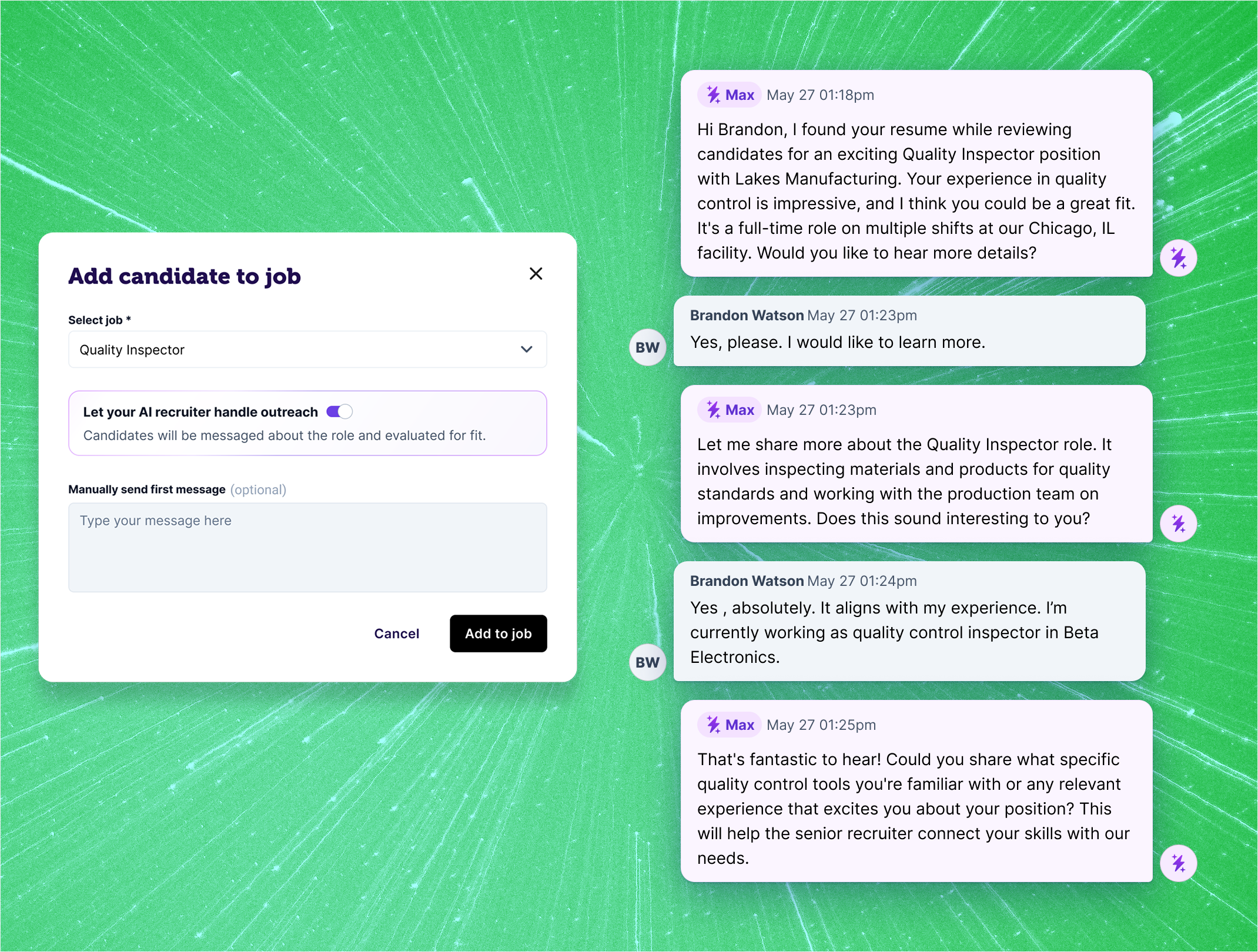 The key improvements focus on giving you control over AI behavior from guiding screening conversations to enabling your recruiters to learn from your feedback. Whether you need to ensure critical topics are always covered or you want that AI touch on a candidate you sourced on your own, these updates ensure your AI recruiting team works exactly how your business needs it to.